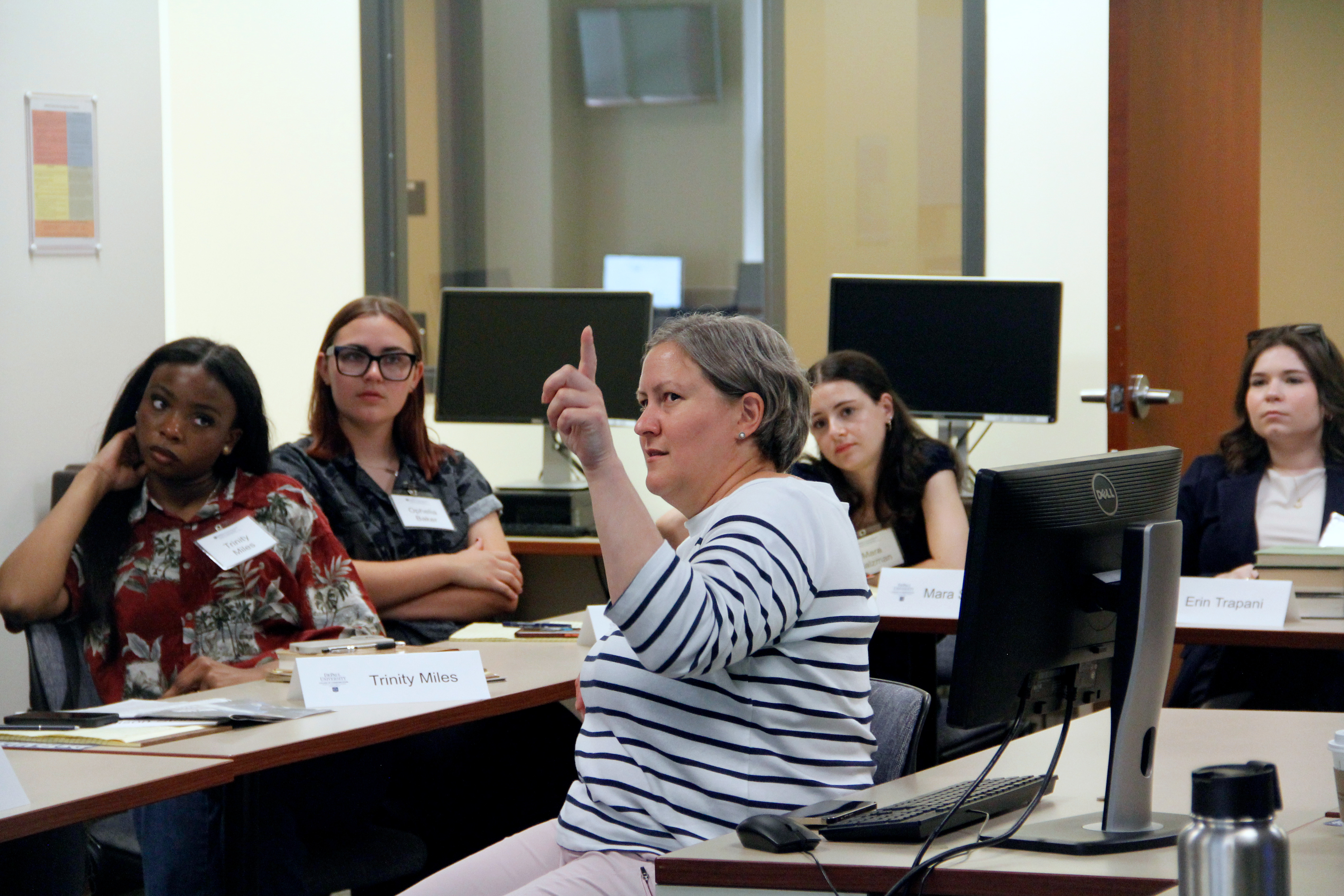 DePaul Professor Robin Hoecker teaches a workshop during a journalism workshop on July 15, 2025. The students participated in interactive workshops with faculty and news leaders. (Aubreonna Chamberlain/DePaul Student Photo Agency)