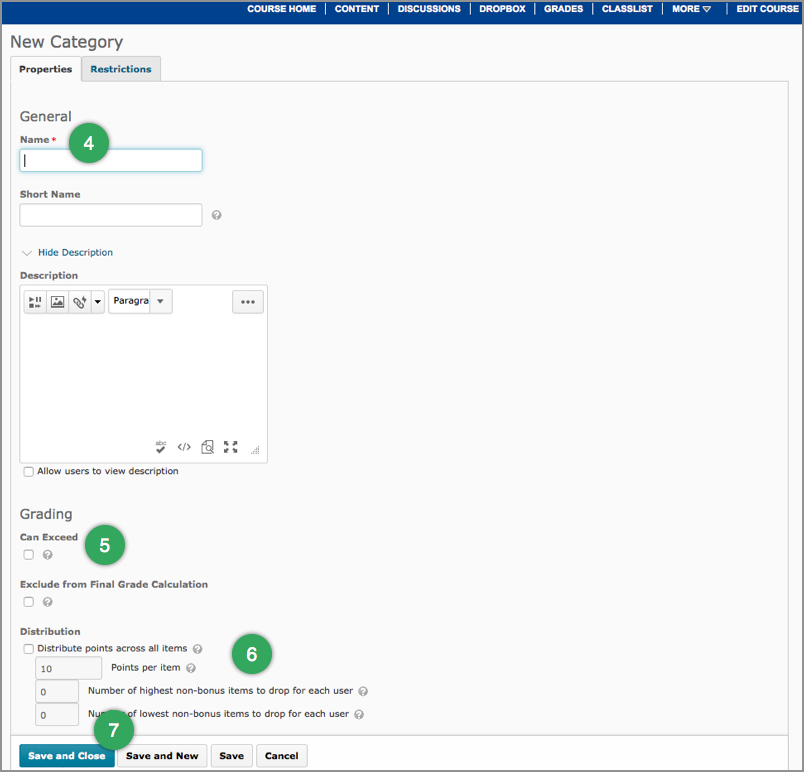 "Distribute weight evenly across all items" makes all items in the category even in weight. (Optional) Enter the number of grade items for D2L to automatically drop in the "Number of lowest non-bonus items to drop for each user" field.